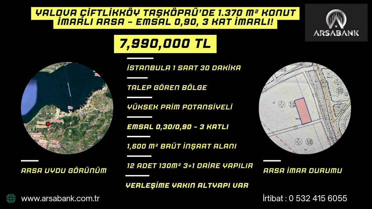 🏡 YALOVA ÇİFTLİKKÖY TAŞKÖPRÜ’DE 1.370 M² KONUT İMARLI YATIRIMLIK ARSA